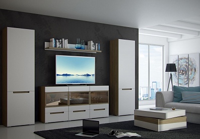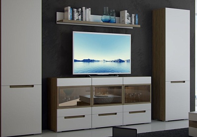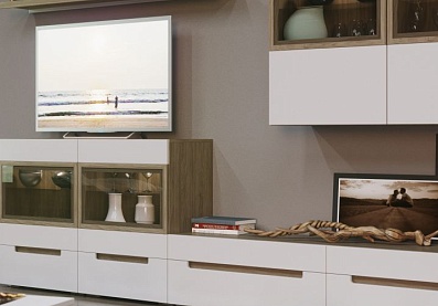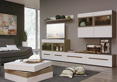 Современные модульные стенки в гостиную отличаются высокой функциональностью. Они предусматривают набор мебели, в который может входить тумба, подставка под ТВ, пенал, шкаф, навесные полки и другая мебельная продукция. Все элементы выполнены в едином стилистическом направлении, что создает гармоничную композицию, подчеркивая интерьер комнаты.
