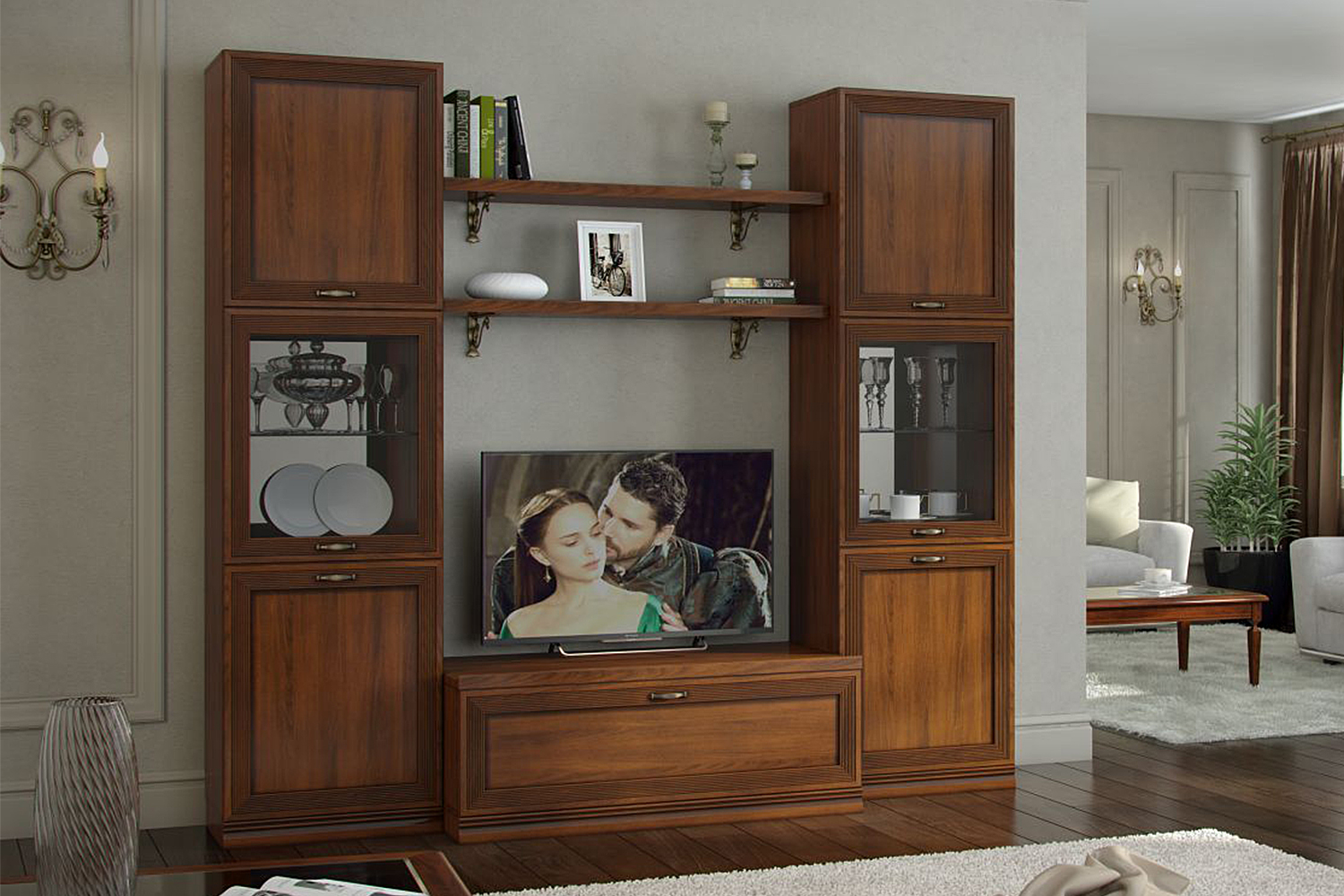 - Для гостиной используется крепежная фурнитура и механизмы ведущих производителей (Titus, Hettih). Такая фурнитура позволит мебели прослужить дольше, не требуя частого ремонта;