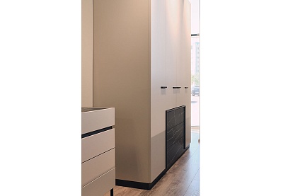 Все модули гармонично сочетаются друг с другом. Черный акцентный мрамор добавляет коллекции изысканности и роскоши, а выразительная геометрия тонких черных ручек на фасадах, перетекающая в линию опор, придают ей современный вид.