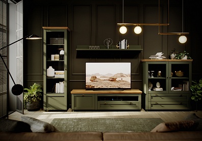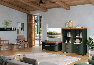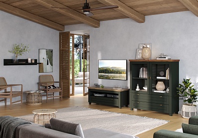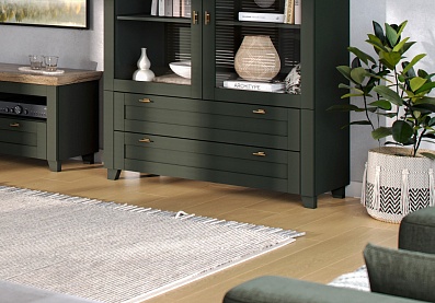 - Комод на деревянных опорах с 4-мя выдвижными ящиками и 2-мя распашными фасадами;