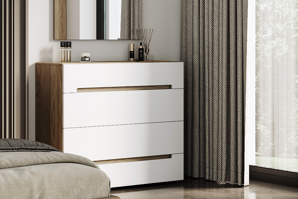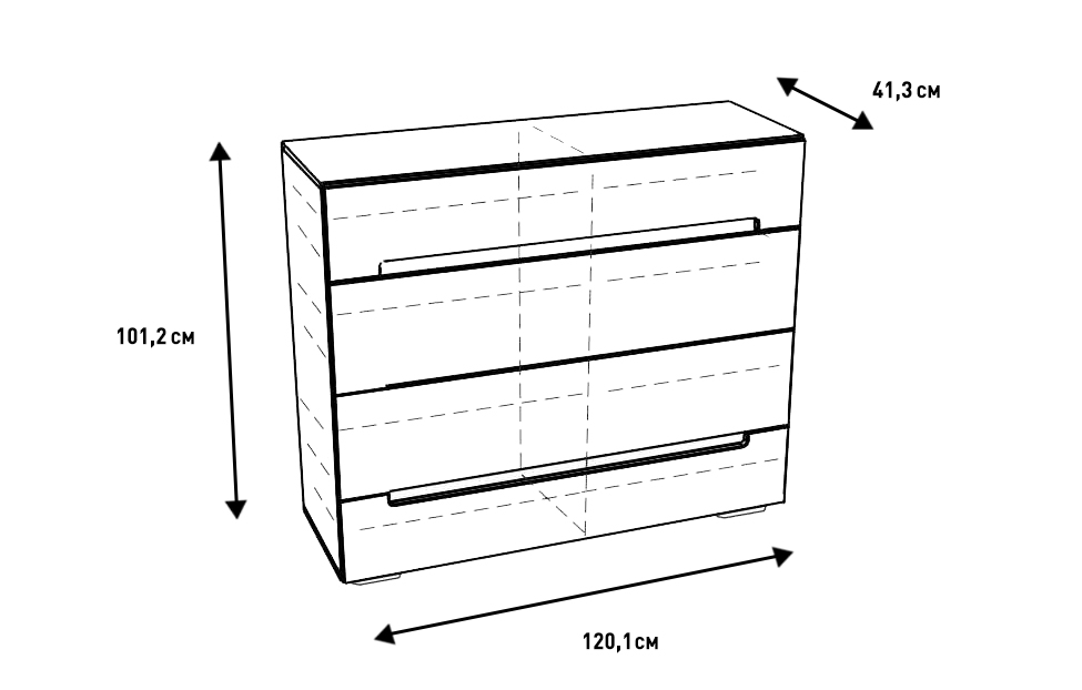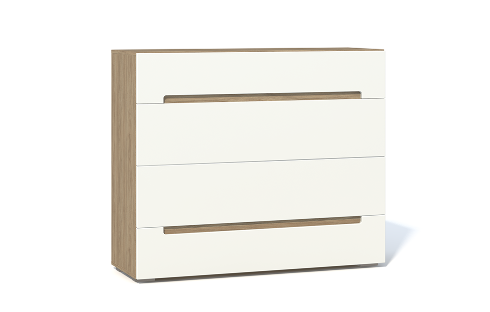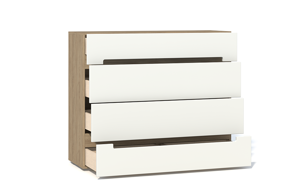 - Комод напольный с четырьмя выдвижными ящиками (каждый ящик с двумя отделениями). В выдвижных ящиках используются направляющие скрытого монтажа со встроенным доводчиком;