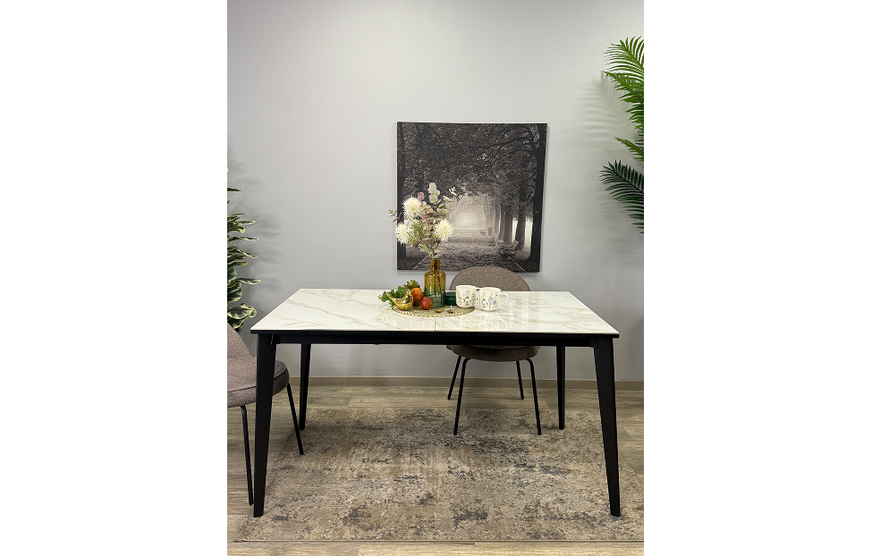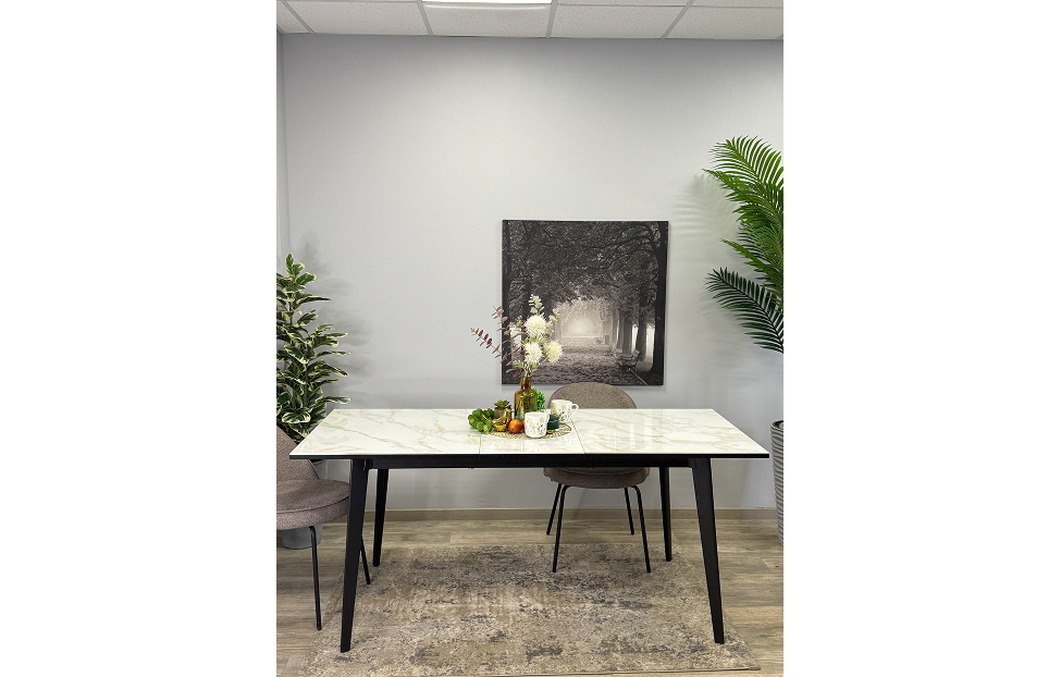 Стол обеденный Дега раздвижной KR1400 – стильный и практичный стол с керамической столешницей, которая отличается высокой прочностью и долговечностью. Каркас выполнен из стального профиля и окрашен в черный цвет, который гармонично сочетается с глянцевой поверхностью керамики.