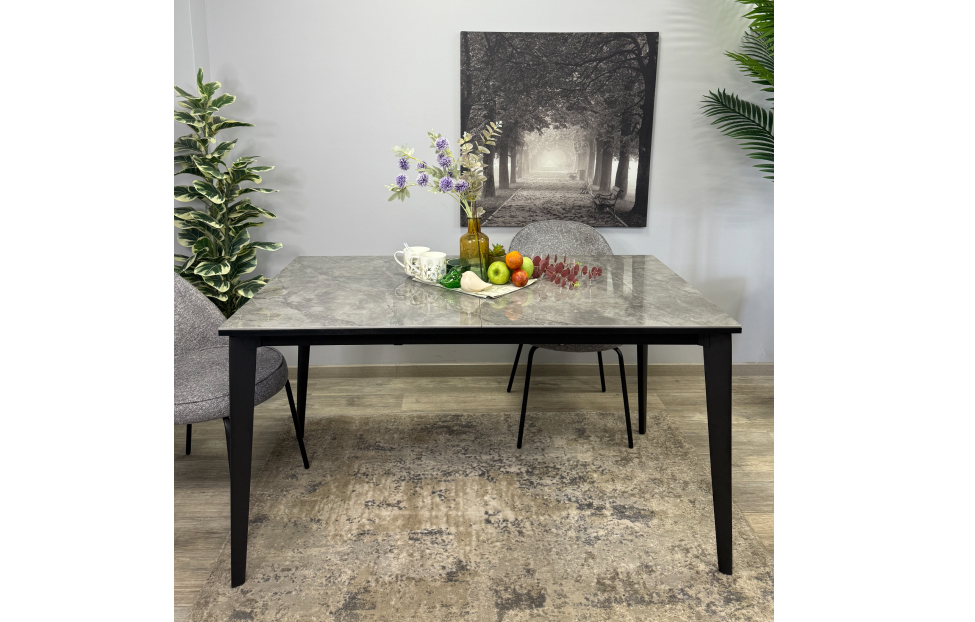 Стол обеденный Дега раздвижной KR1400 – стильный и практичный стол с керамической столешницей, которая отличается высокой прочностью и долговечностью. Каркас выполнен из стального профиля и окрашен в черный цвет, который гармонично сочетается с глянцевой поверхностью керамики.