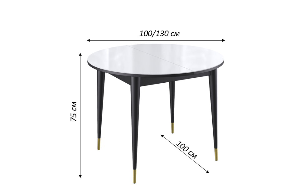 Стол обеденный Мане круглый раздвижной К1000 опоры черные с металлическими наконечниками, столешница - стекло белое глянец.